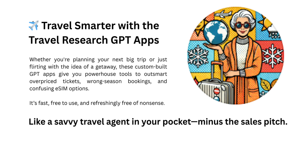 Whether you're planning your next big trip or just flirting with the idea of a getaway, these custom-built GPT apps give you powerhouse tools to outsmart overpriced tickets, wrong-season bookings, and confusing eSIM options. It’s fast, free to use, and refreshingly free of nonsense.